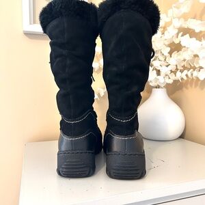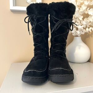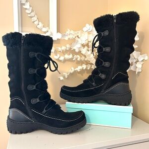 Keep your feet warm and dry this winter, not to mention totally in style, with these Bare Traps Stay Dry System Boots. The Baylee style features a black suede upper with white contrast moccasin style stitching, faux fur lining and accent, full lace up front with a side zip for easy entry. Sturdy Rubber non slip outsole. Cushioned insole adds comfort and warmth. 10” Shaft with a slightly slouchy look. Size 8.5. Regular price $175