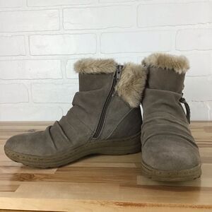 Keywords: neutral tone gorpcore outdoor winter boots ankle booties faux fur contemporary warm winter boots suede leather beige