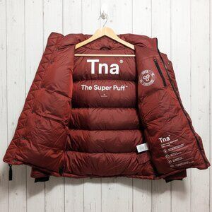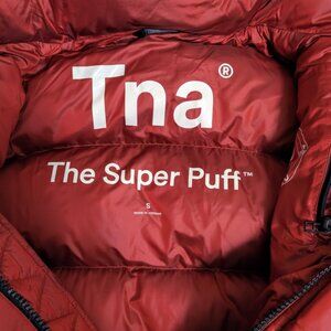 The famous TNA Super Puff Jacket is being sold "AS IS" at a low price due to noticeable imperfections. The main flaw is the presence of visible black stains/marks on the front of the jacket. The buyer should be prepared to either clean the jacket themselves or have it professionally dry cleaned.