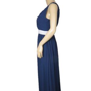 Indulge in the timeless elegance of the Bari Jay navy blue gown, featuring a sophisticated V neckline and a flattering empire waist that accentuates your silhouette with grace. This floor-length masterpiece exudes sheer poise, making it a perfect choice for any special occasion, from a party to a wedding. The off-white faux belt adds a touch of contrast and style, while the sleeveless design ensures comfort and freedom of movement throughout the night. Elevate your evening with this stunning ensemble that combines classic charm with modern allure. Capture hearts and turn heads in the Bari Jay navy blue gown that promises to make you feel like a true fashion icon!