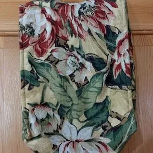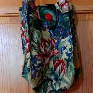 Vintage fabric bag by Susan 1999 collections.Floral design Bark cloth vintage fabric and button Unique bag.Greens ,Maroon, light mustard and black colors. As shown.In Like New Condition.