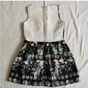 Baroque floral sleeveless mini dress featuring a jacquard floral print and a zipper back closure. Size Small petite, approximately size 2-4. Please see approximate measurements.