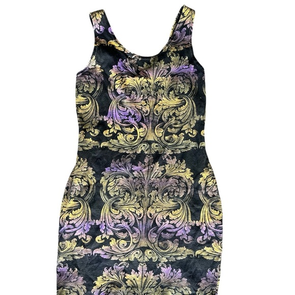 Turn heads in this gorgeous sleeveless bodycon dress featuring a bold Baroque-style floral pattern in gold, lavender, and blush tones on a black background. Super flattering scoop neckline and curve-hugging fit—perfect for nights out, parties, or special occasions.