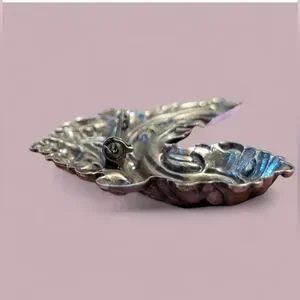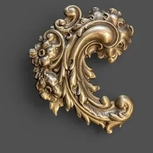 This baroque or rococo style brooch is a piece of ornamental jewelry with a pin and clasp on the back for attachment to clothing. The design of the brooch features a deeply detailed, ornate floral and scroll motif. The raised design on the metal appears to have been created using a technique called repoussé, where the material is hammered from the reverse side to create a relief.