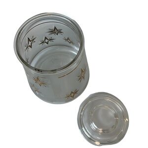 Beautiful Vintage Bartlett Collins gold and frosted white star atomic starburst pattern cookie jar. In great used vintage condition. There is some paint loss / scratches on the gold areas, but that is to be expected for a piece of this age. No chips or cracks, and comes with the lid. Please see photos for measurements.
