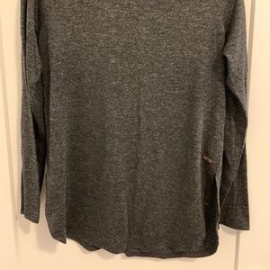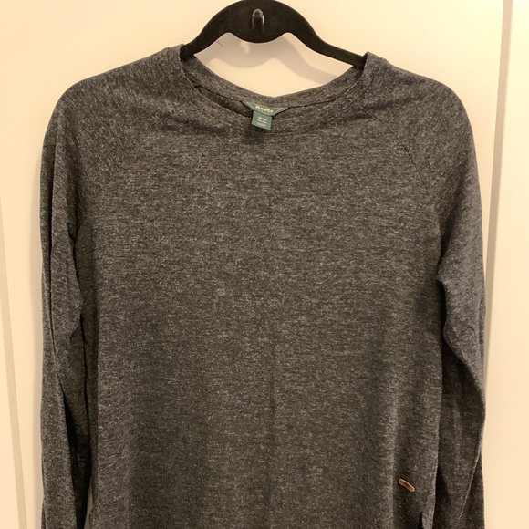 This shirt has 3/4 sleeves, and slits on the side. It is a relaxed fit.