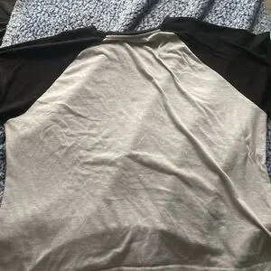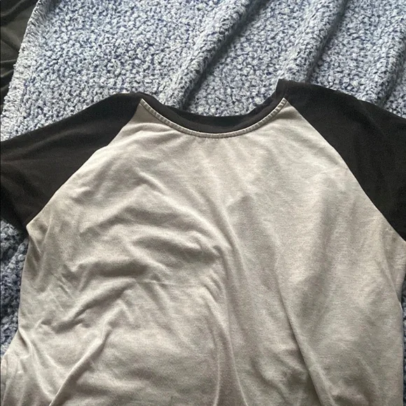 Black and light grey, short sleeve, baseball tee. Tags and brand are not specified on any tags. Best fits a size large or x-large. Has been worn many times but still in good condition. Some pilling but no rips, stains, or discolouration. (free stickers included in every order!!) 🫶🏻