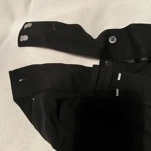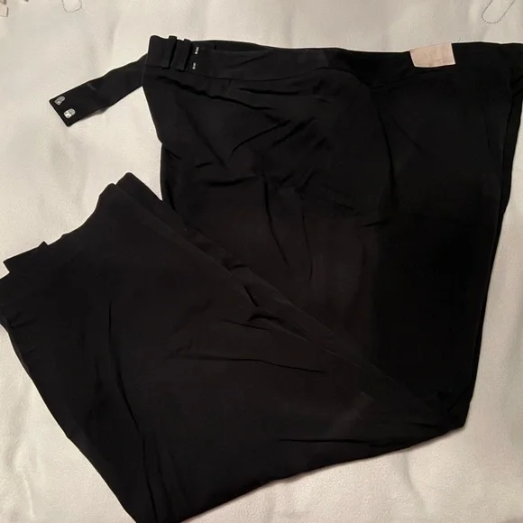 These are basic black pants; great for work; the waist has a strap to hide the top button