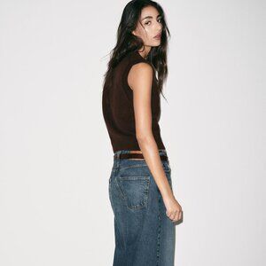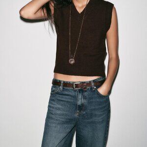V-neck knit sweater vest with sleeveless design. Ribbed trim. Color is Dark brown. Size XL. New!