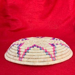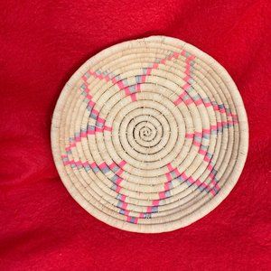 Basket, Inuit Eskimo Vintage Native Indigenous art hand woven round, star design, 7.5"x2", three colours of reed; pink, blue, beige