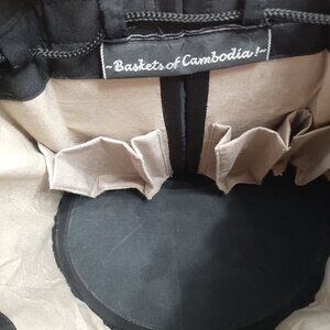 Check out this Basket of Cambodia Drawstring Woven Straw Black & Tan Tote Bag in very great pre-owned condition. no rips or stains on the bag and inside the lining the bag is very handy perfect for summer time.