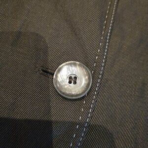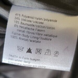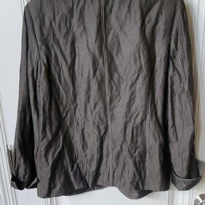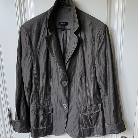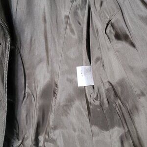 Basler, EUC, Size M per P to P measurement of 19", olive green, lined jacket, with contrasting white stitching, patch pockets, cuffs have slit to roll, has a crinkled look to it, no visible marks, stains or tears.