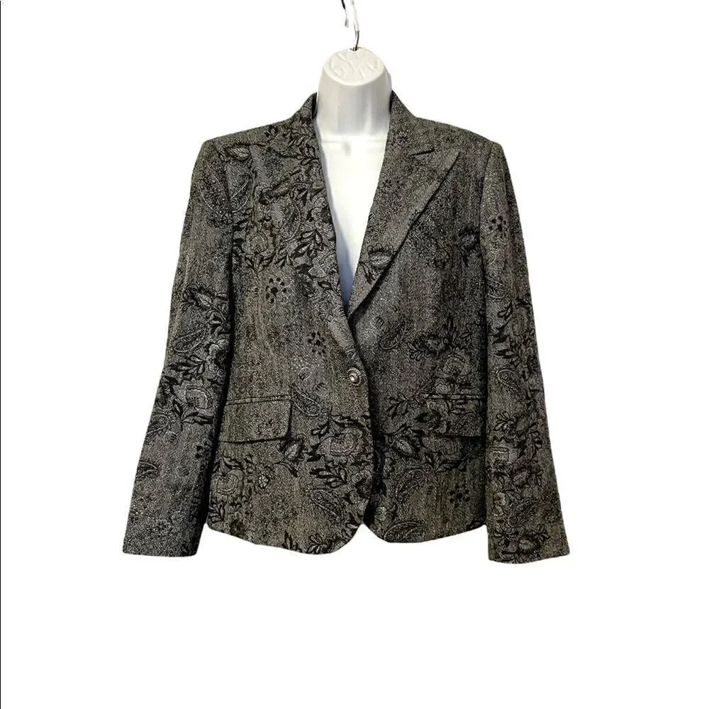 This classic timeless wool blazer is a rich grey with tone on tone floral pattern. Tinsel in the fabric gives it just the right amount of pop and the versatility to wear it with denim or for a Holiday event. Measurements are approx. and taken laying flat,