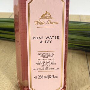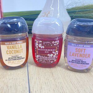 Includes: Bath & Body Works Rose Brush & Go Fragrance Gel, 0.52 Fl oz / 15.6 ml. New In Box but base of box has a small tear as pictured. Approx 6" tall. Great for travelling, Rose Water & Ivy 8 Fl oz Gel Hand Soap with essential oils, 3 scented anti-bacterial 1 Fl oz, Soft Lavender, vanilla coconut, Winterberry ice. All new.