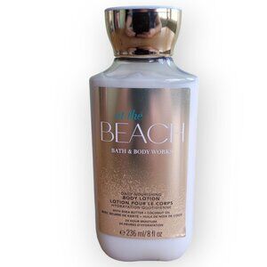 Indulge in Bath & Body Works' At the Beach Body Lotion for a smooth, refreshing sensation. This 8oz bottle is new and offers a beach day aroma with frangipani blossoms, toasted coconut, and bergamot waters.
