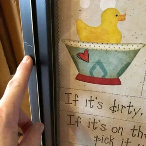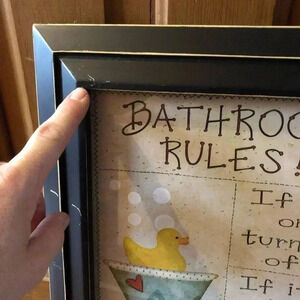 Adorable little framed “bathroom rules” list. Frame from Michaels originally, does have a couple scratches.