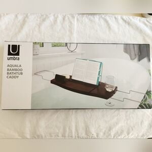 Dark stained bamboo wood bathtub caddy extendable tray with popup stand to hold a book or magazine, Aquala by Umbra.