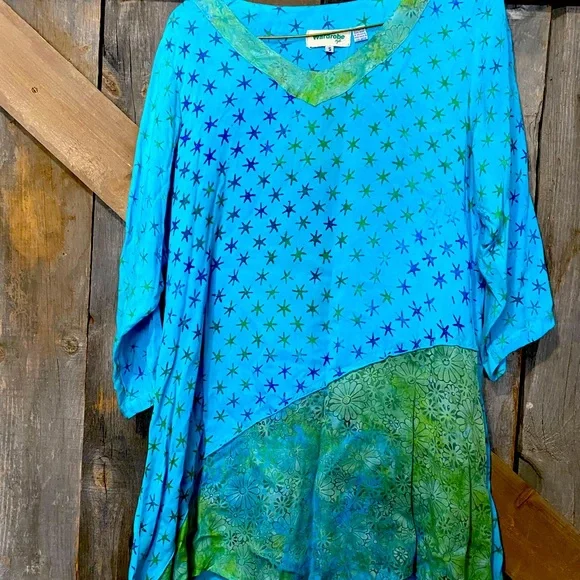 Batik look tunic with asymmetrical high low detail. Very light. Never worn