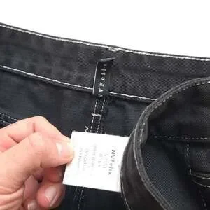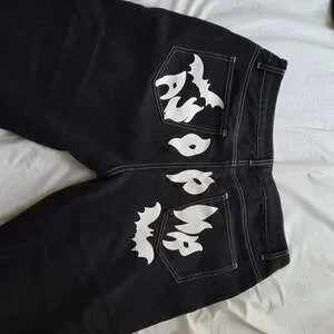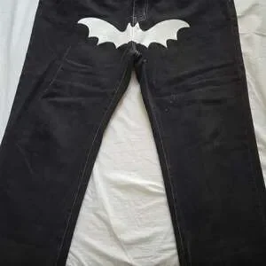 NVFelix Batman Graphics Black Jeans, Streetwear Style, One Size. These unique black denim jeans feature a large white bat graphic across the front lap and various bat-inspired motifs on the back pockets and legs. Constructed from a durable 75% cotton and 25% polyester blend with distinctive white contrast stitching. Great for streetwear enthusiasts or fans of the Batman aesthetic. Good pre-owned condition with some light signs of wear. No major holes or tears. Perfect for casual urban outfits.