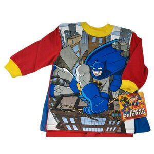 This bold DC Super Friends pajama set is perfect for bedtime and playtime. Features a cotton knit top with Batman in a cityscape design, matching pants with a Batman logo, and a detachable cape for extra superhero fun. A playful and harder-to-find 3-piece set that comes brand new with tags.