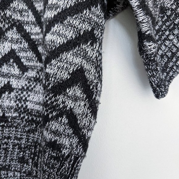 Lux Anthropologie batwing sweater with grey and black zigzag print. 3/4 length sleeves. 80s vibe. Made in USA. Size M. 95% Acrylic, 5% Nylon. Has some light pilling throughout, and especially under the arms and along hems.
