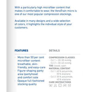 If you are on your feet a lot or have to stand for long periods of time, you will enjoy the benefits that VenoTrain micro has to offer. The compression effect relieves pressure on your legs and promotes circulation thereby reducing aches, pains and swelling. The compression is highest at the ankle, gradually decreasing up the leg. The high microfiber content makes this compression stocking exceptionally soft and elastic. You will not sweat under it and it always allows sufficient air to circulate to your skin.