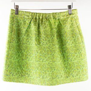 The Sloane miniskirt from Baum Und Pferdgarten is made in a textured synthetic fabric with a Green Heather metallic leopard pattern, and features a tight fit, a front double button and zip closure, patch pockets in the front, an elasticated back, and is lined in a tonal synthetic fabric.