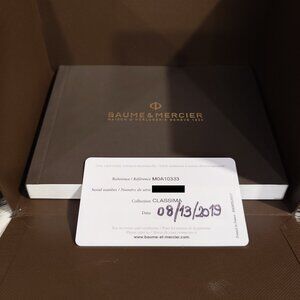Presenting an exceptional Baume & Mercier Classima (Model M0A10333) in pristine, unworn condition, complete with the original box, full international warranty, and manual. The crystal retains its protective plastic cover, highlighting its untouched state.