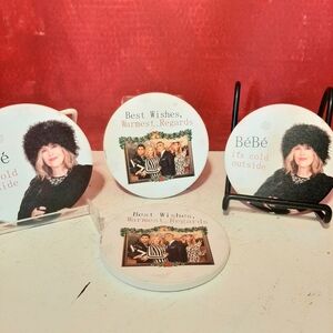 Set of round coasters featuring holiday designs with 'Bébé' text. Perfect for festive gatherings.
