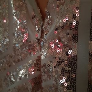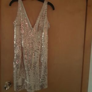 The perfect cocktail dress by BBX Lephsnt in Size S. Fully lined dress is in cream with gold coloured pattern in sequins. Zippered back. This dress measures 33" shoulder to hem and 16" armpit to armpit.