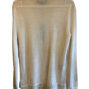 A beautiful sweater, long sleeves, longer in back than front, a sheer v-neck down the front of the sweater, excellent quality. Size medium, New with Tags. Cream white.96% Merino Wool.