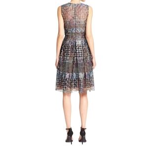 Bcbgmaxazria multicolor metallic engendering embroidery vneck pleated bodem which is double lined, side pockets, zip closure.