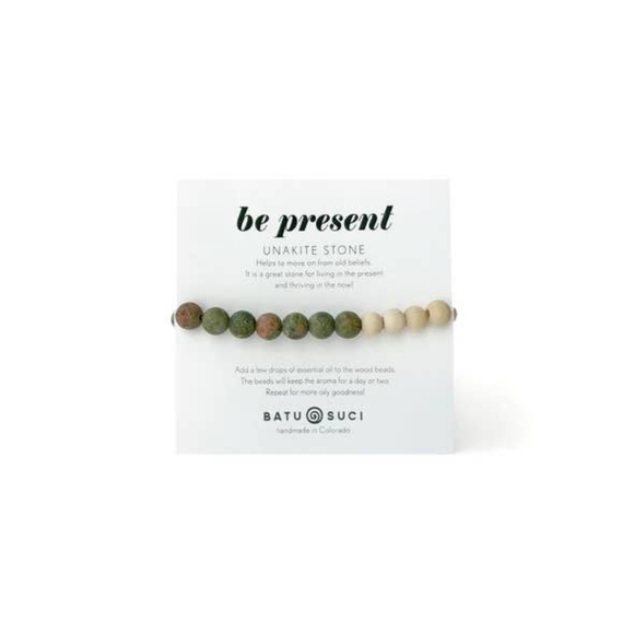 Unakite and wood beads strung on stretchy cord help to bring healthy and healing energy into your life. Wear one or stack a bunch! Strung durable stretchy cord. Fits wrist sizes 6.0 inches - 7.0 inches. Bead size 8mm. Comes on display card for a great gift!