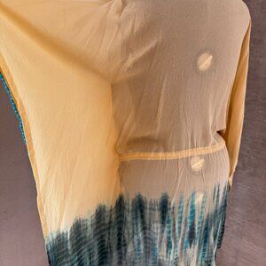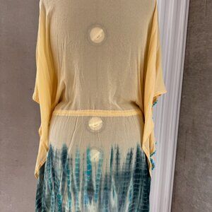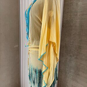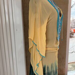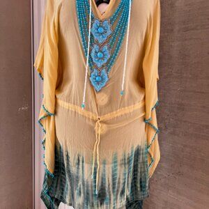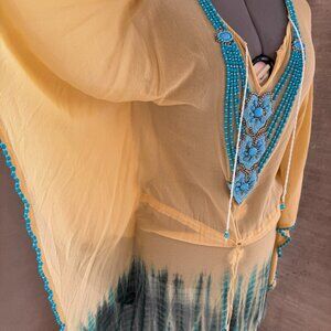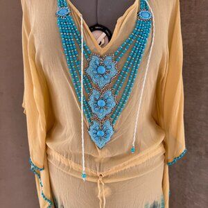 Silk Beach Cover-Up The embroidery showcases delicate patterns, reminiscent of nature or traditional motifs, skillfully incorporating the turquoise stones that add a pop of color and texture. Each stone is carefully placed, glistening against the silk, creating an eye-catching focal point. The cover-up may have flowing sleeves and a relaxed silhouette, making it perfect for both casual and formal occasions. This exquisite piece combines elegance with a touch of bohemian charm, making it a standout addition to any wardrobe.