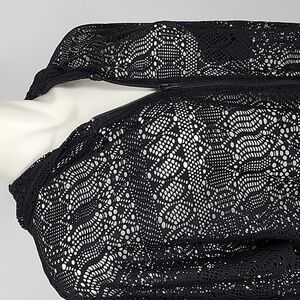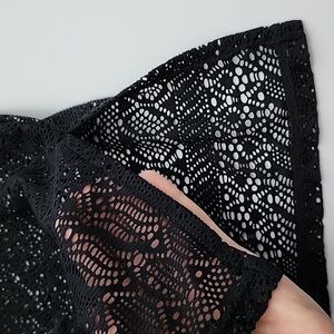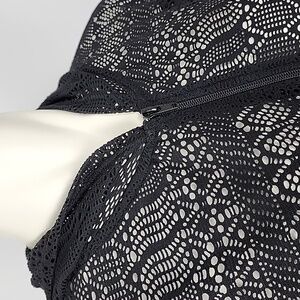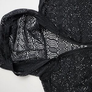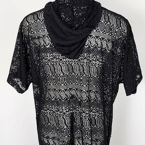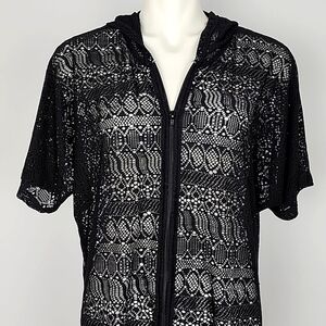 Excellent pre-owned condition, beach pool black crochet lace cover-up dress with hoodie and full front zipper and short sleeves, size Small / Medium.