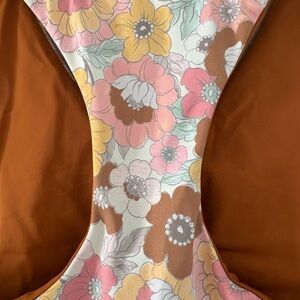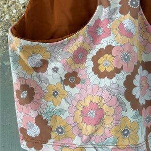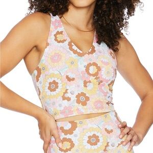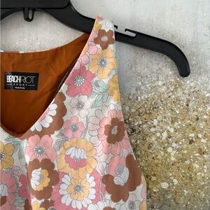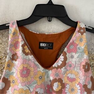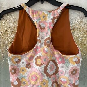 Size: Medium. Style: Autumn Floral. 75% polyester; 25% spandex. Vibrant, retro inspired floral Beach Riot sport tank top. Mod floral design in pastel and taupe hues. Racerback top with built-in bra. Made in USA.