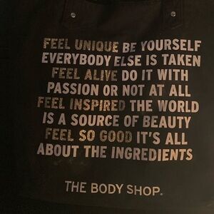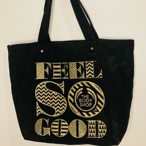 Cute black and gold travel/beach bag from the body shop. Included inside will be a few beauty surprises. 🎁😉🥰
