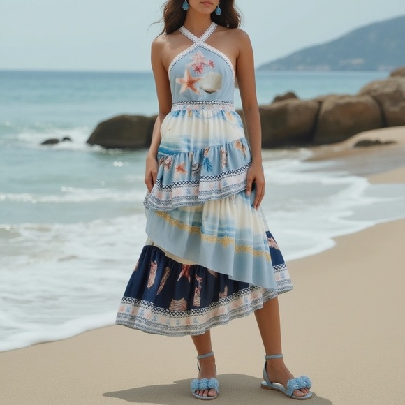 Beach-Themed Halter Maxi Dress-Missing external and internal tags