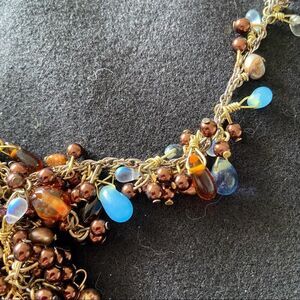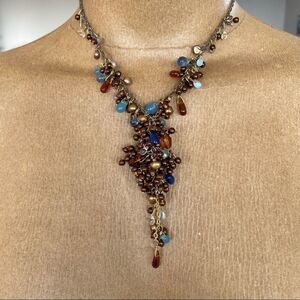 Oaak handmade Bead cluster necklace in brown, amber and blue tones on a sliver tone chain