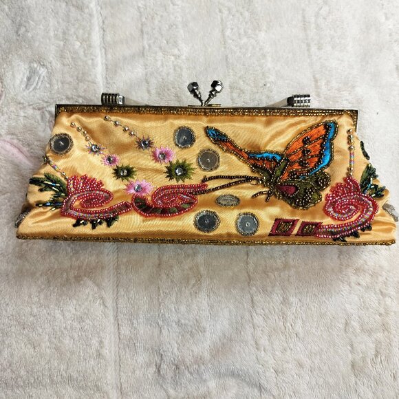 THE PIECE: A breathtaking statement clutch perfect for your next special event. This structured bag features a vibrant, hand-beaded butterfly motif on a shimmering gold satin base. Adorned with intricate sequins, beads, and mirror-style accents, it captures a beautiful "Boho-Luxe" aesthetic. It includes both a fixed top handle and an optional silver-tone chain strap for versatility. Fits a modern smart phone.