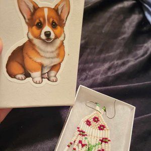 These pre-loved beaded earrings were purchased from a crafter in Vancouver BC about 15 years ago, they have white, green and red beads strung on thread and I added sterling silver hooks. The shape and length are flattering and feel regal and elegant to wear yet relaxed and casual at the same time🥰 These will be mailed in the little white box shown, with an adorable corgi sticker on the top.