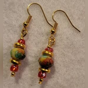 Colourful faceted, gold and red beaded earrings. Handmade by Kitty Brand new. Never worn. One of a kind.
