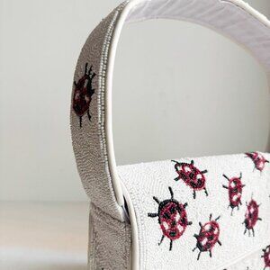Beaded Lady Bug Lucky White Red Large Baguette Bag.