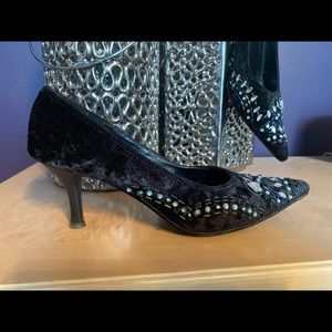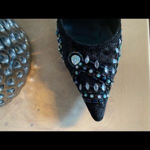 These stunning black crushed velvet-like pumps have unique embellishments of beads and shell-like stones. These shoes are like new and in original box!