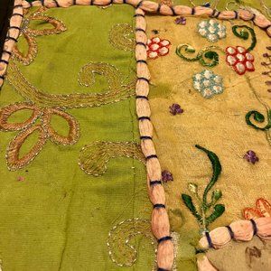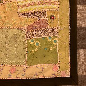 Beautiful tapestry hand made from old wedding saris. Patchwork pieces with lovely stitching, beads and sequins. 5' x 3 1/2'