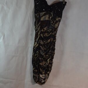Wow! Heavily sequinned and beaded Bust 38 Body Con Dress. The bra has an underwire and there is a single strap you can use or not that goes around the neck.The bottom is an animal print similar to a leopard and t is stretchy and is Rouched or gathered. SZ S bust according to tag is 38. Meishulanna