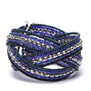 Looking for a cuff style bracelet that will make a statement? Look no further than our Beaded Wide Memory Wire Bracelet! This stylish accessory features three bands of acrylic beads, shades of purple, blue, black and metallic silver. The wide design makes it the perfect accessory for a night out or a special occasion, while the memory wire ensures that it will fit comfortably on any wrist. Whether you're looking for a bold accessory to complete your outfit or want to add some colour and sparkle to your everyday look, this bracelet is perfect for you.