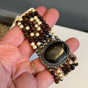 Brown, cream and black beaded bangle bracelet. Stretchy so is super comfy.