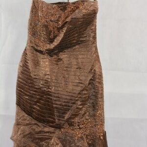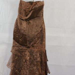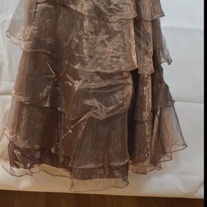 Beautiful Prom Dress! Very light and Airy. It is a strapless Dress with lots of diagnal pleats accented with applicate with sequins and beads. The bottom has 5 tiers of light organza type of fabric. SZ L by Fiesta. Has tags for straps and extra beads but no tags. It looks new without tags but cannot say that it is.