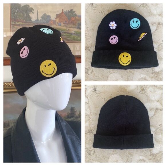 Celebrate a timeless & positive brand with this Smiley World® beanie! It features a fun and retro patch design with smiley faces, daises, and lightning bolts. It is in excellent condition, basically new.